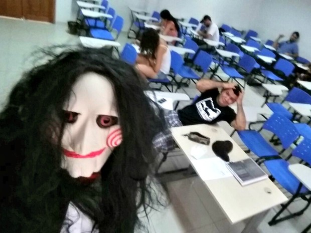Bem humorado, professor se inspirou em Jogos Mortais e viralizou nas redes sociais (Foto: Reprodução/Facebook)O filme não inspirou apenas a fantasia do professor, mas também a metodologia da prova. Os alunos tinham que produzir as questões para que os colegam respondessem. Quanto mais difícil a questão, mais pontos o aluno conseguia alcançar. Todos os alunos, segundo o professor, foram aprovados.